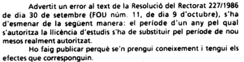 CORRECCIÓ d'error de la Resolució del Rectorat 227/1986 de dia 30 de setembre per la qual s'autoritza una llicència d'estudis per al professor Jordi Ortín Rull.